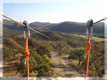 São duas tirolesas realizadas consecutivamente, uma de 700m e outra 500m. Uma indo e outra retornando.